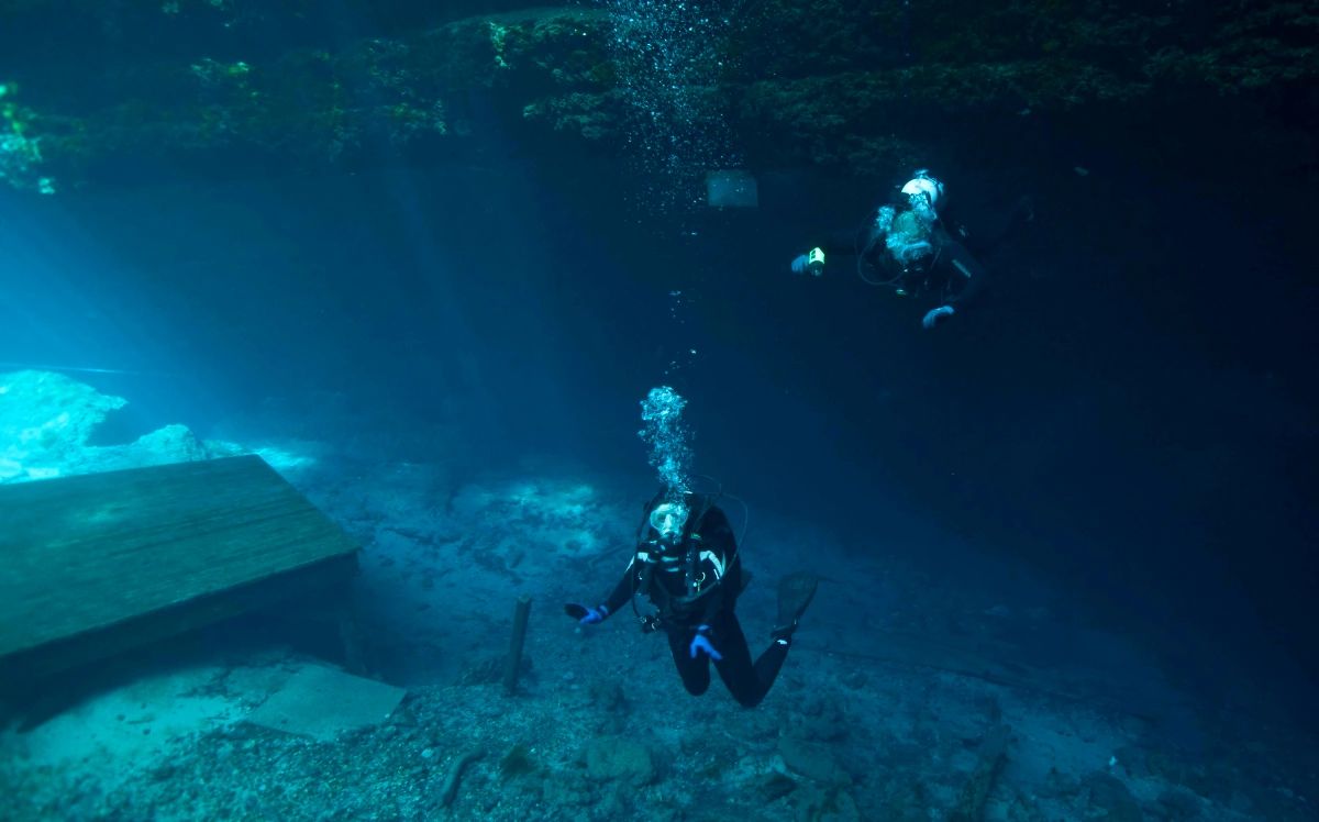 Paradise spring is a beautiful spring that presents all kinds of prehistoric fossils from dish size sand dollars to whale bones. This is an Advance dive, and the spring is 110 ft at the end of the cavern zone. At 10 to 15ft the roof of the cavern is cared by possibly prehistoric fire made by man. The surface of the spring is small, maybe 20 x 20 ft and a short walk down stone carved steps.